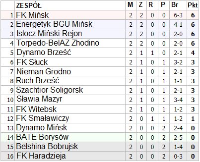 Tabela po 2. kolejce Belarusbank Wyszejszaja Lihi wygląda tak: