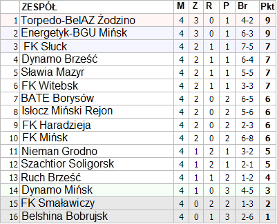 Tabela po 4. kolejce Belarusbank Wyszejszaja Lihi wygląda tak: