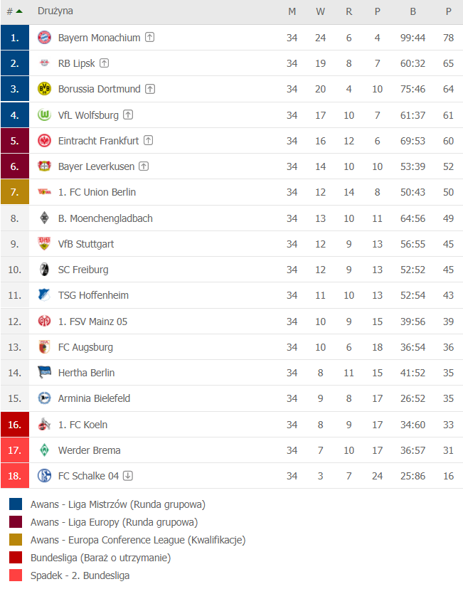 Mistrz – Bayern Monachium oraz RB Lipsk, Borussia Dortmund i VfL Wolfsburg zagrają w przyszłej edycji Ligi Mistrzów. Eintracht Frankfurt oraz Bayer Leverkusen zagrają w Lidze Europy. Natomiast Union Berlin weźmie udział w kwalifikacjach do nowego turnieju organizowanego przez UEFA, czyli Conference League.