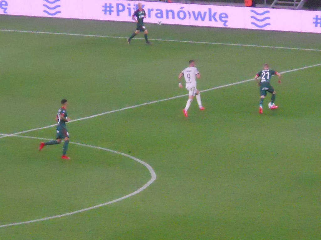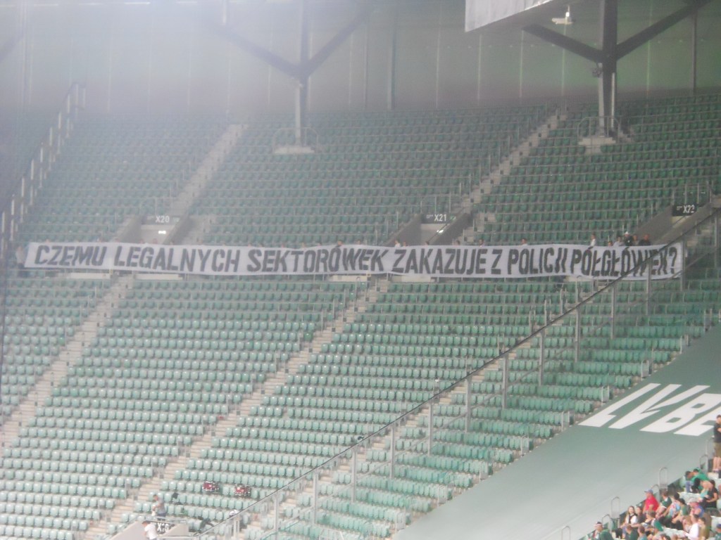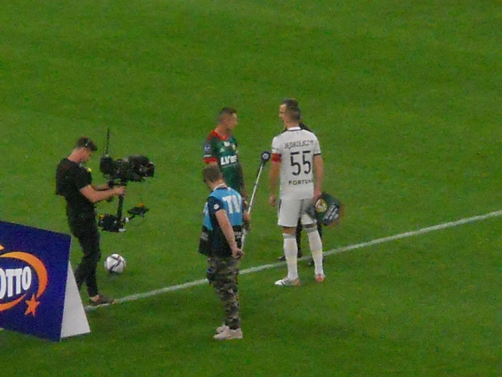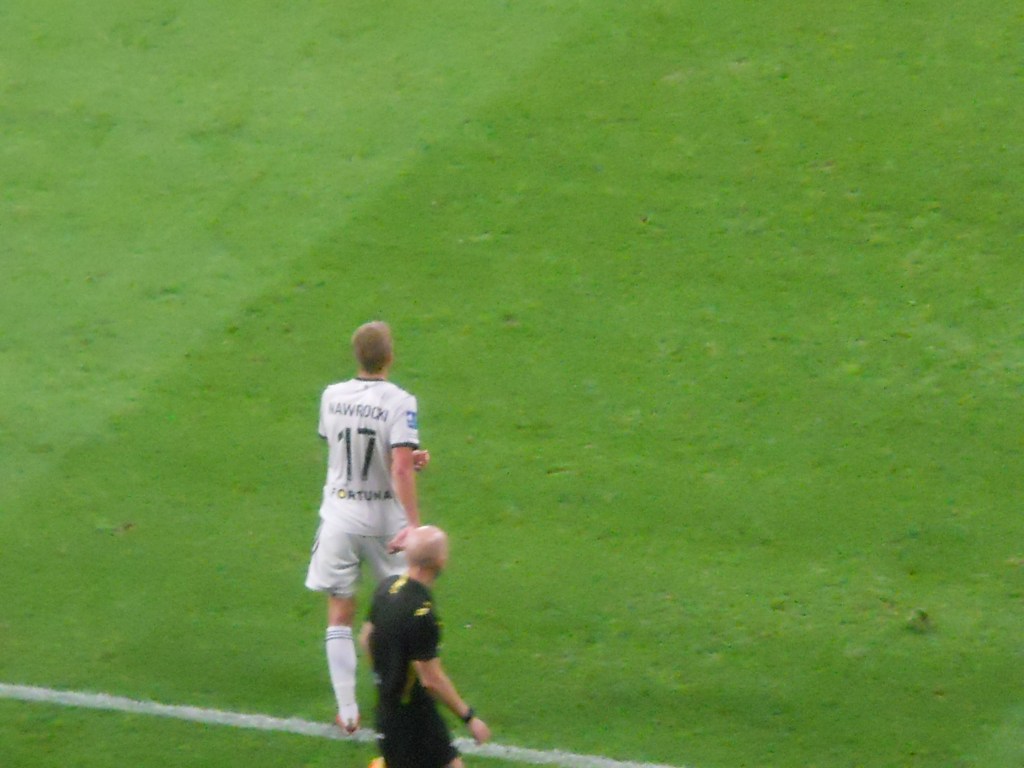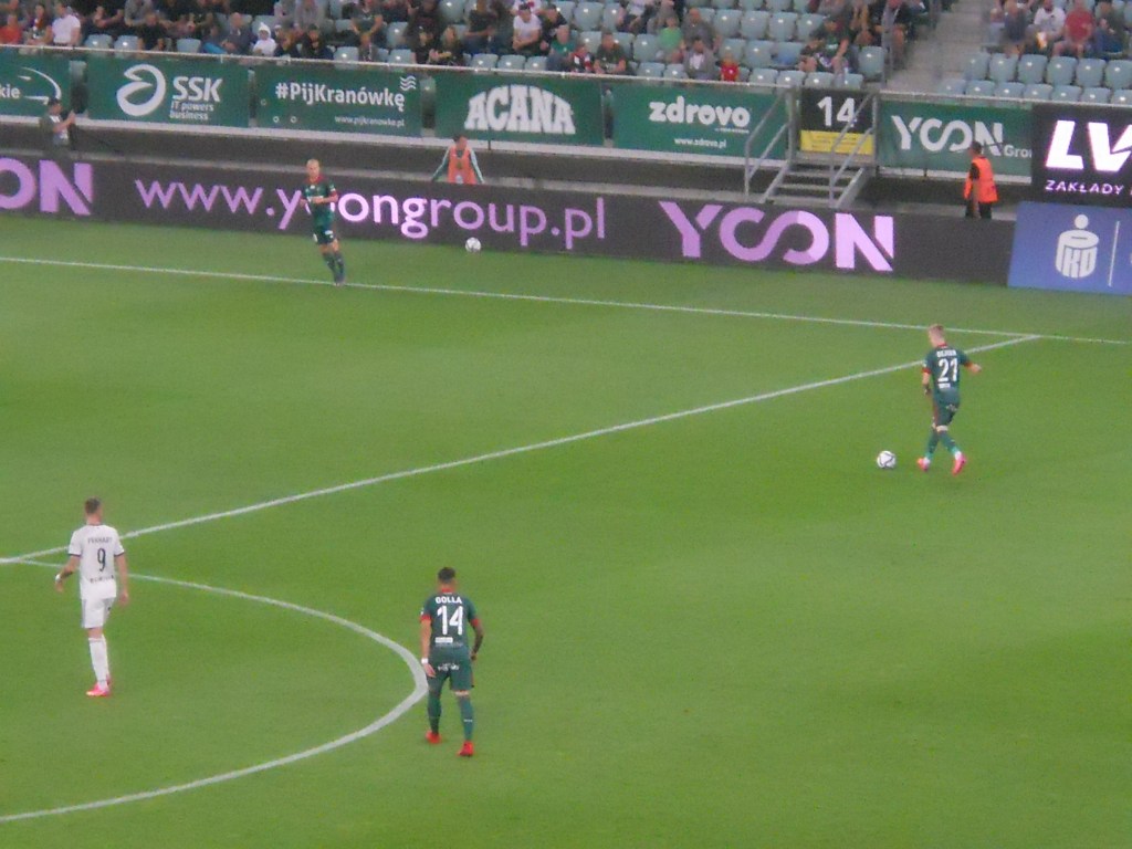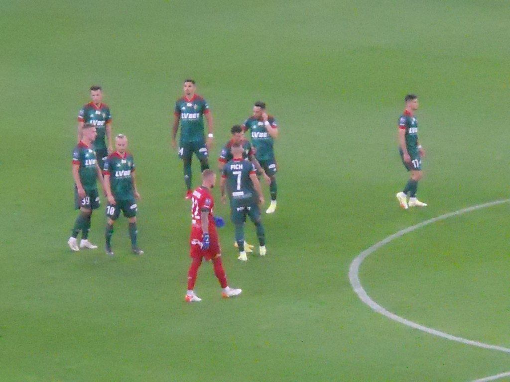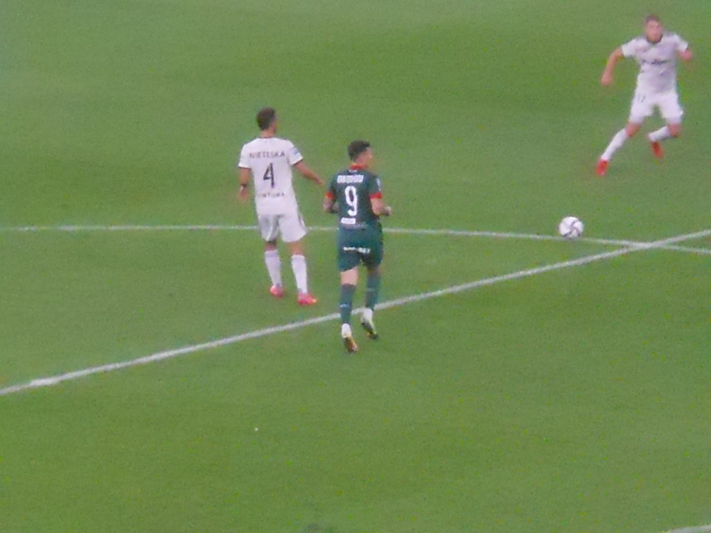 Pierwsza połowa spotkania obfitowała w wiele strzałów, które mogły dać bramki. Z początku przewagę miał zespół ze stolicy. Z czasem to gospodarze przejmowali inicjatywę. Liczna grupa fanów Legii przyjechała na spotkanie, z czasem kibice gości wyszli ze swojego sektora, wywieszając transparent (treść zobaczycie na zdjęciu), a następnie wrócili wspierać dopingiem „Legionistów”. Do przerwy bramkarze obu drużyn zachowali czyste konta.