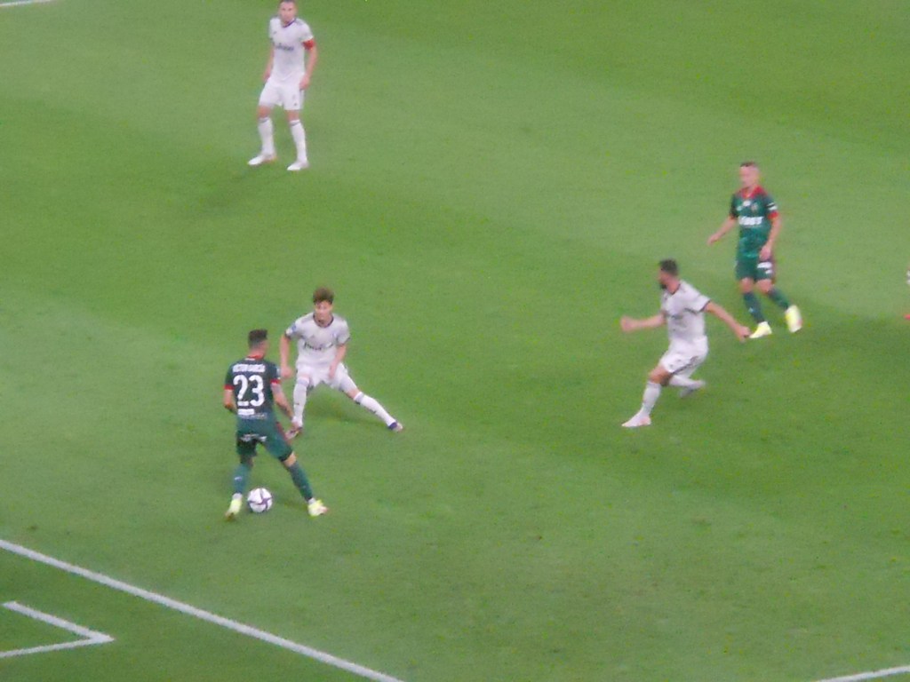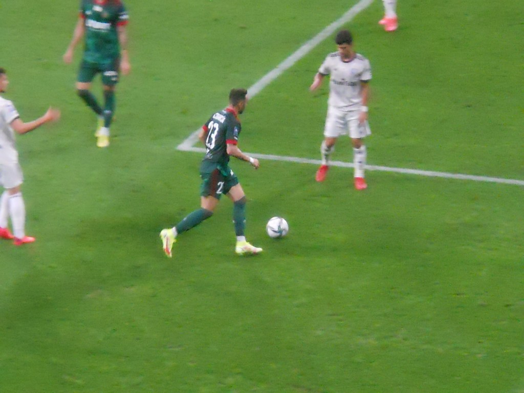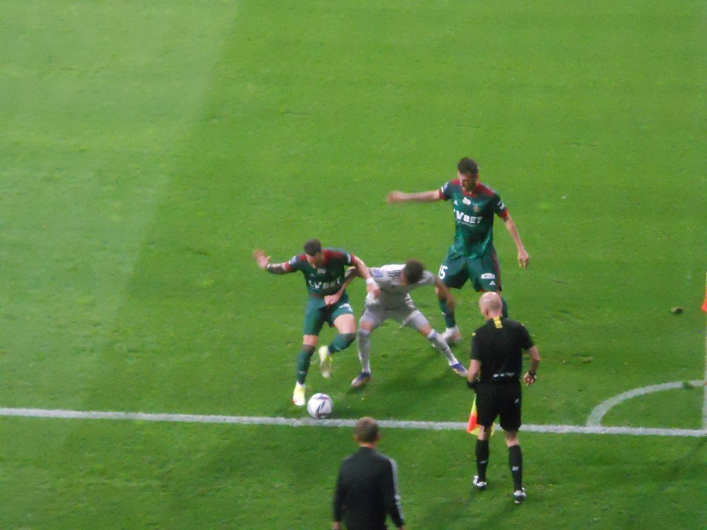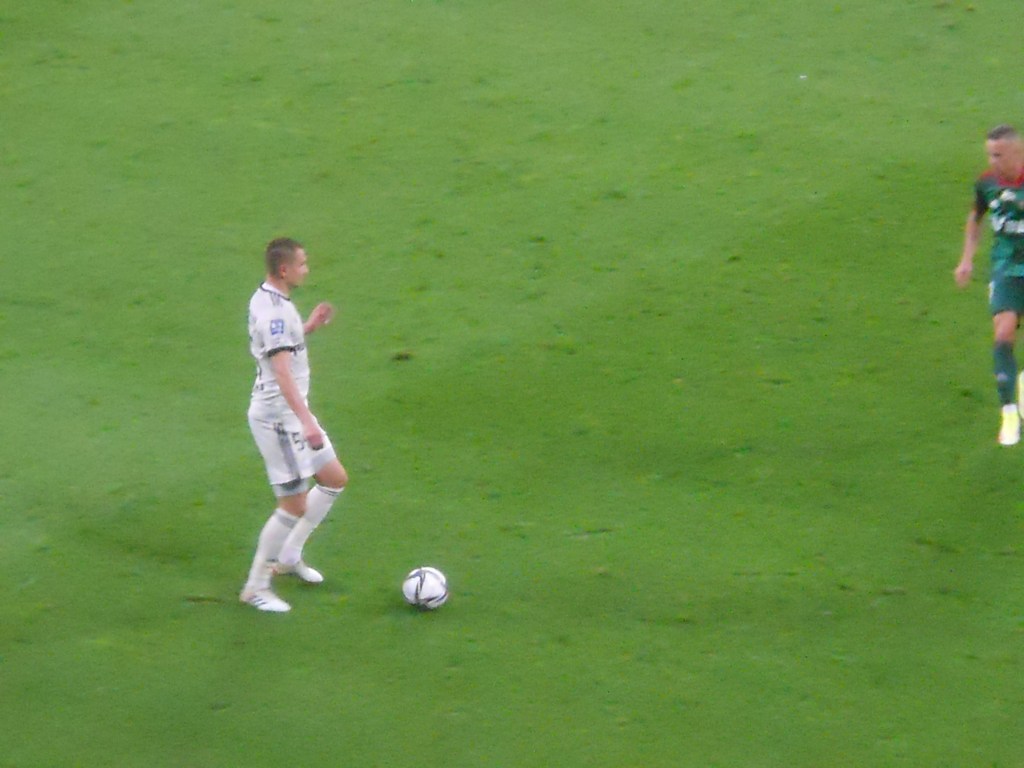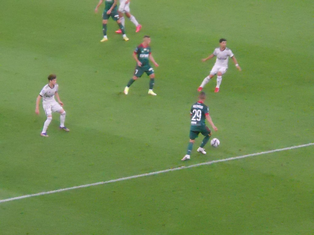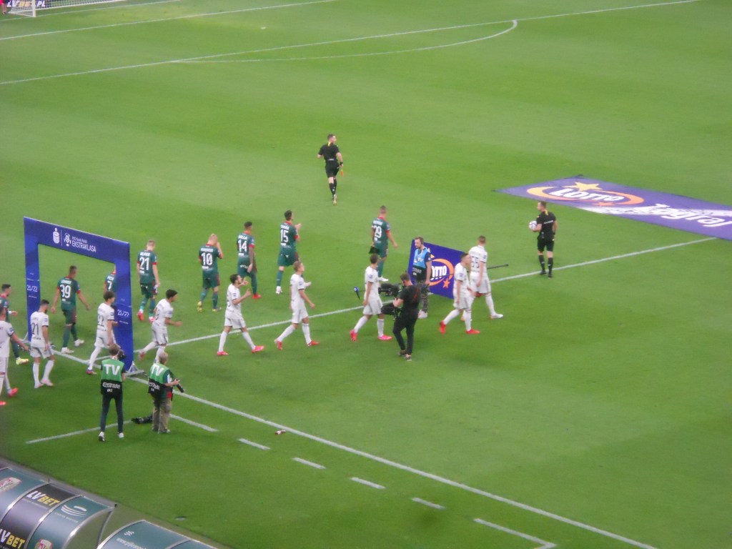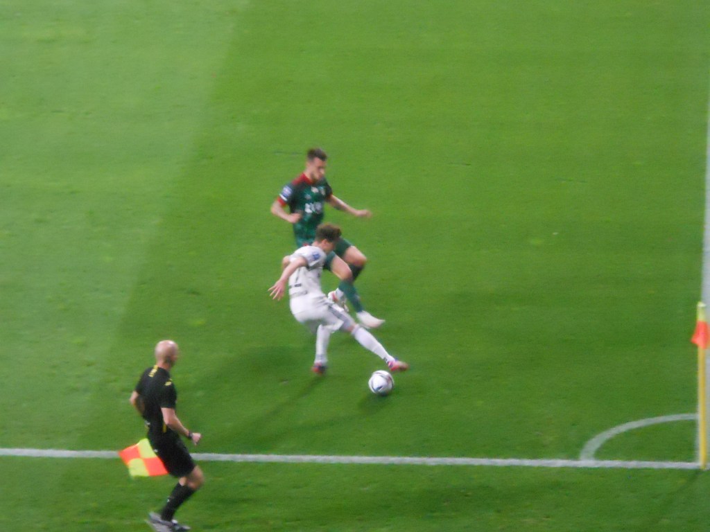 Pierwsza połowa spotkania obfitowała w wiele strzałów, które mogły dać bramki. Z początku przewagę miał zespół ze stolicy. Z czasem to gospodarze przejmowali inicjatywę. Liczna grupa fanów Legii przyjechała na spotkanie, z czasem kibice gości wyszli ze swojego sektora, wywieszając transparent (treść zobaczycie na zdjęciu), a następnie wrócili wspierać dopingiem „Legionistów”. Do przerwy bramkarze obu drużyn zachowali czyste konta.
