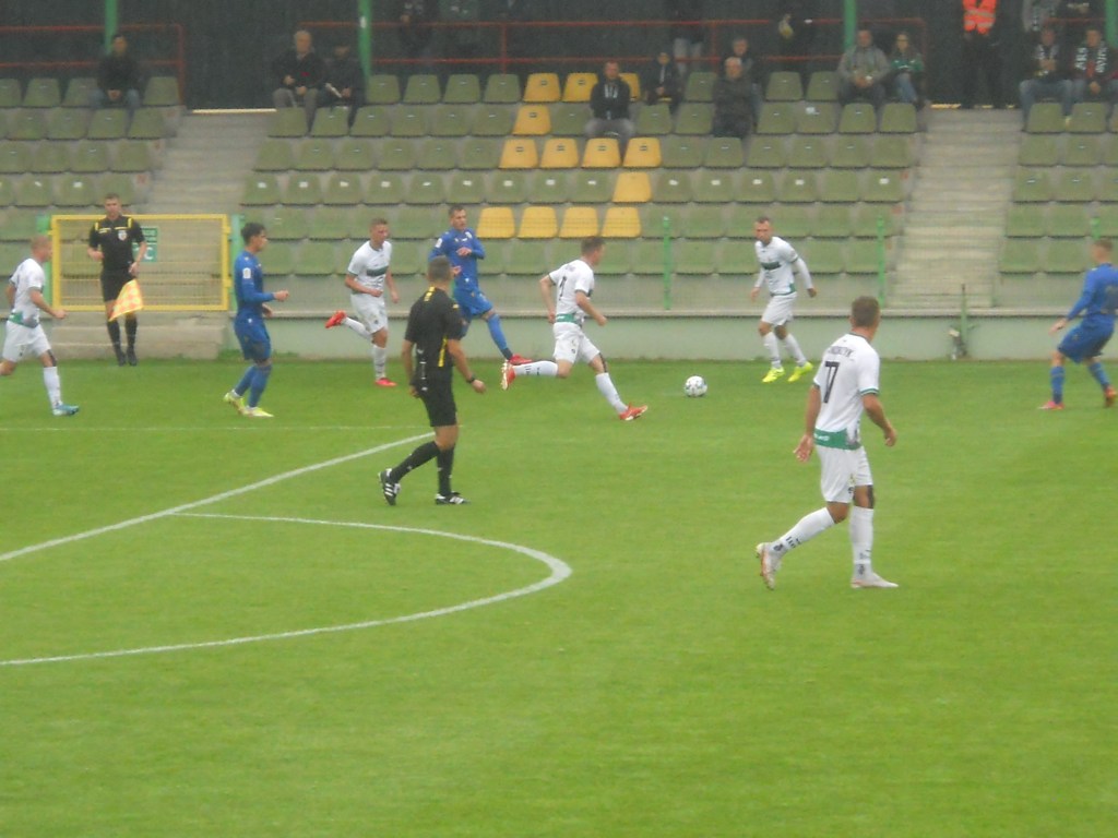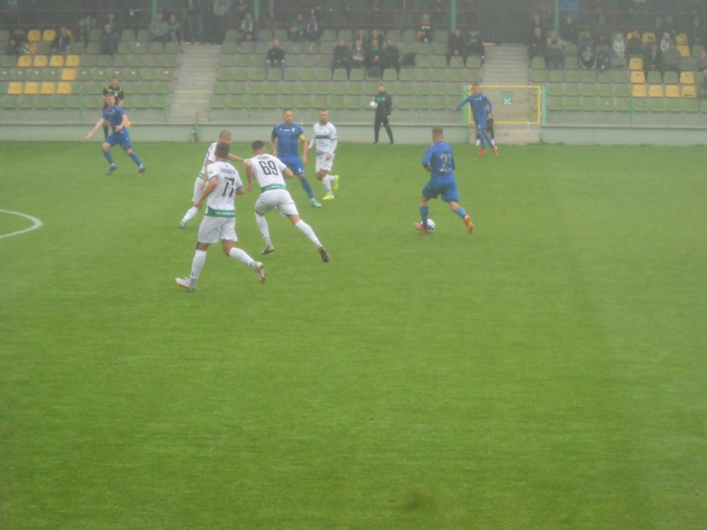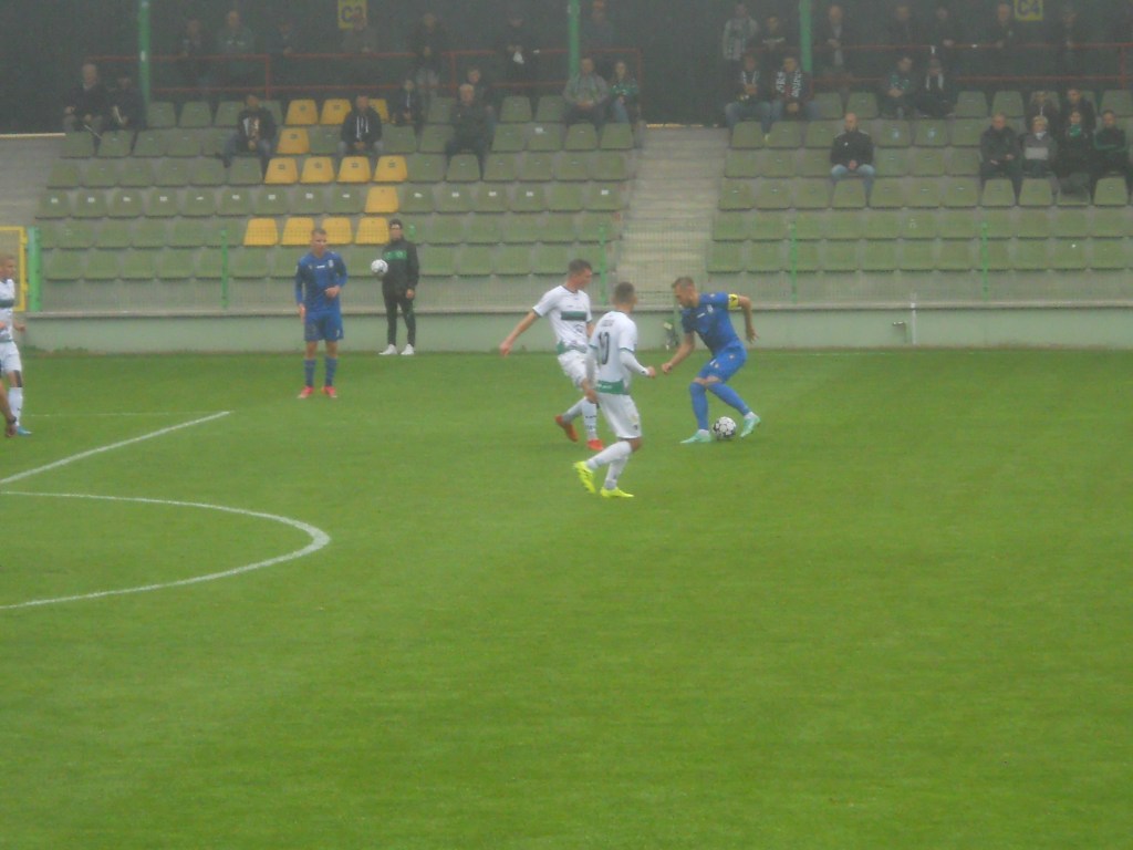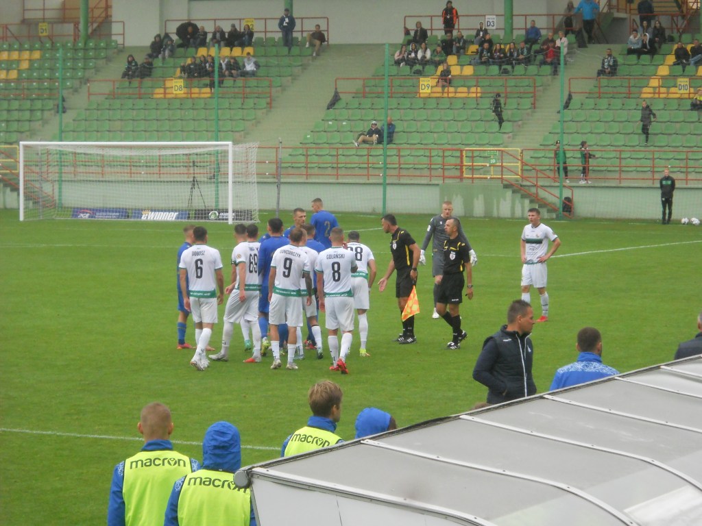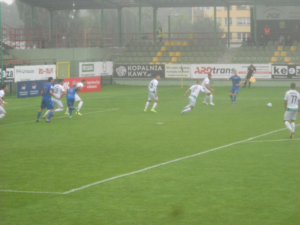 Chłodny i deszczowy dzień meczowy, nie przyciągnął zbyt wielu kibiców – na stadionie zameldowało się jedynie 610 kibiców. Pierwsza połowa spotkania GKS-u Bełchatów z rezerwami Lecha Poznań zakończona wynikiem 0:0. Obie drużyny próbowały zdobyć bramkę, jednak żadnej się nie udało. Pod koniec pierwszej połowy doszło do małego spięcia – faul Maksymiliana Pingota na Mateuszu Gancarczyku doprowadził do tego, że ten drugi uderzył w ogrodzenie boiska.