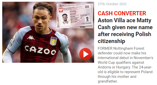 Matty Cash otrzymuje nowe imię po otrzymaniu polskiego obywatelstwa i może zadebiutować na arenie międzynarodowej w listopadzie – tak brzmi tytuł artykułu „The Sun”, który poinformował o przyznaniu polskiego obywatelstwa obrońcy Aston Villi (my o nadaniu obywatelstwa Cashowi pialiśmy tutaj).
