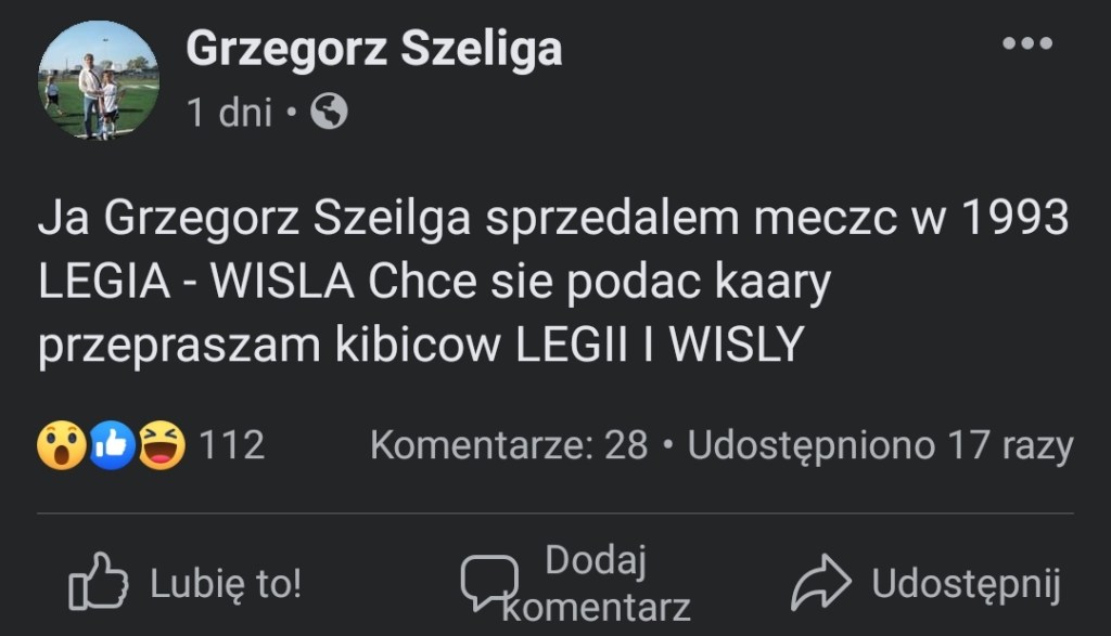 Wróćmy jeszcze do meczu Wisła vs. Legia. „Białą Gwiazdę” reprezentował Grzegorz Szeliga. Niedawno na swoim Facebookowym profilu, przyznał się do sprzedania tego meczu.