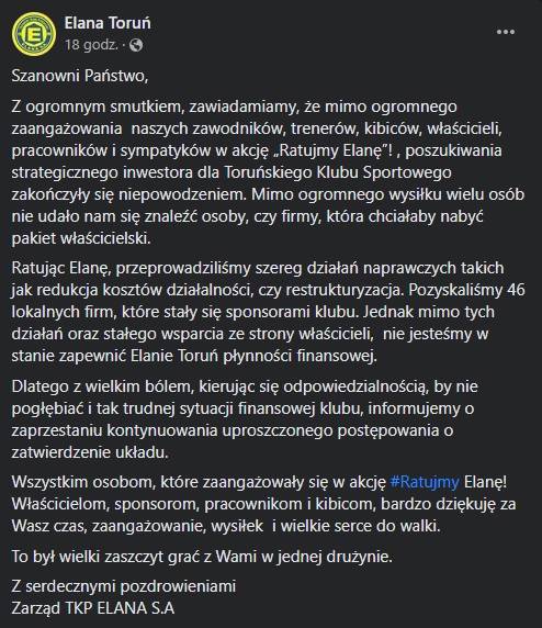 Toruński Klub Piłkarskiego Elana Toruń S.A. swoją decyzję ogłosiła 23 grudnia o godz. 14:05 na Facebooku: