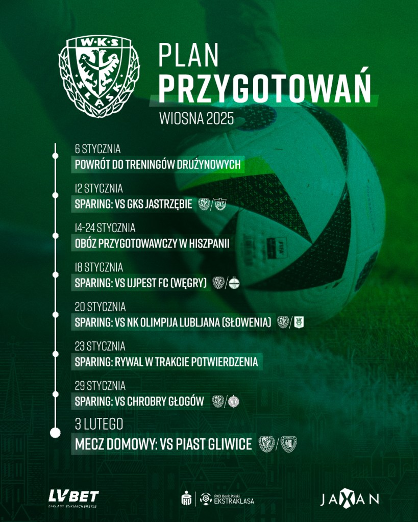 Ostatni mecz 2024 roku Śląsk rozegrał z Radomiakiem Radom 14 grudnia. Trójkolorowi przezimują na ostatnim miejscu w tabeli, więc oczywistym celem na rundę wiosenną będzie jak najszybsze wydostanie się ze strefy spadkowej i utrzymanie w PKO BP Ekstraklasie. By to osiągnąć kluczowe może się okazać odpowiednie przepracowanie okresu przygotowawczego. Czuwać nad tym będzie nowy sztab szkoleniowy pod przewodnictwem Ante Simundzy.