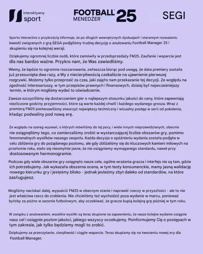 Najpierw premierę FM25 przekładano – najpierw z listopada 2024 roku na marzec, by teraz poinformować, że gra, która – jak pisali twórzy – „nowym otwarciem” ze względu na zmiany w grze. To miała być rewolucja, wiele nowych modułów, grafik, technologii czy rozgrywek powstawało od zera.