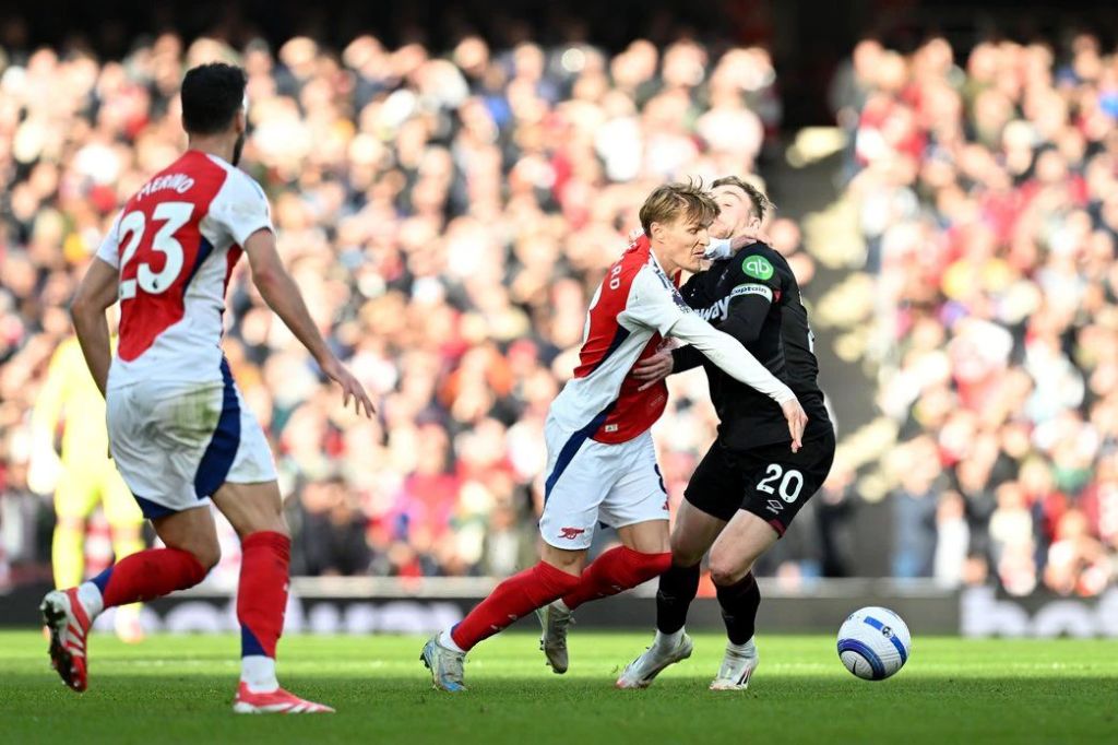 Arsenal kończył mecz w 10. Myles Lewis-Skelly otrzymał czerwoną kartkę w 73. minucie za sfaulowanie Mohammeda Kudusa.