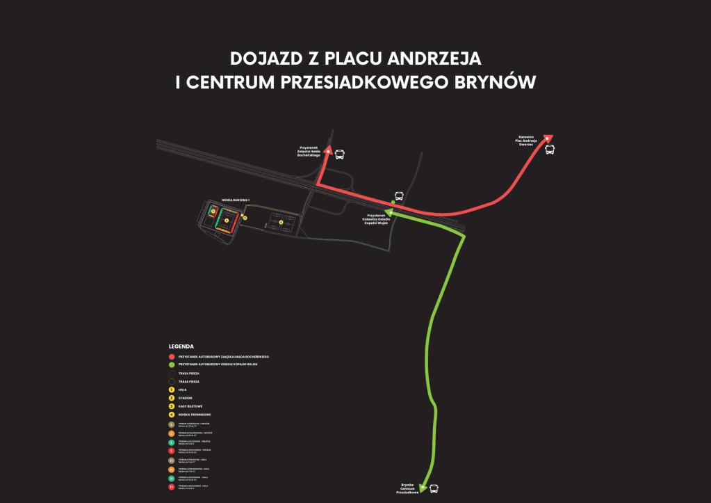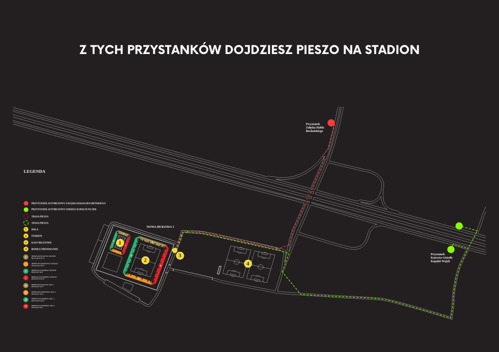Powstający wokół nowego obiektu sportowego układ drogowy, to odrębne zadanie, które cały czas jest realizowane. Będzie on służył nie tylko obsłudze samego stadionu i hali. Dzięki przebudowie ulic Bocheńskiego, Załęska Hałda i Kochłowicka zostanie zwiększona przepustowość, szczególnie dla mieszkańców Ligoty i Panewnik. W związku z pracami na Arenę Katowice nie ma dojazdu samochodem prywatnym. By ułatwić dostanie się na mecz miasto Katowice uruchamia dwie bezpłatne linie autobusowe, które bezpiecznie i wygodnie dowiozą kibiców na miejsce!