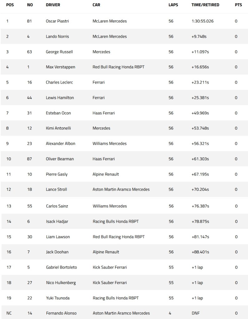 Jedynym zawodnikiem, który nie ukończył wyścigu był Fernando Alonso. Legendarny Hiszpan, który ściga się w barwach Aston Martin, już po 5 okrążeniach wypadł z powodu problemów z hamulcem.